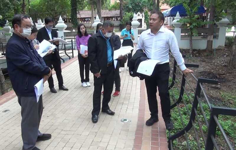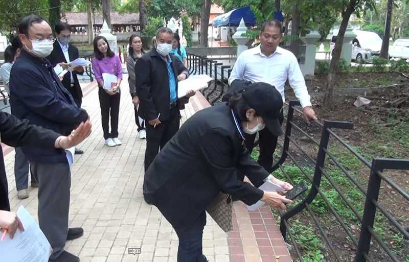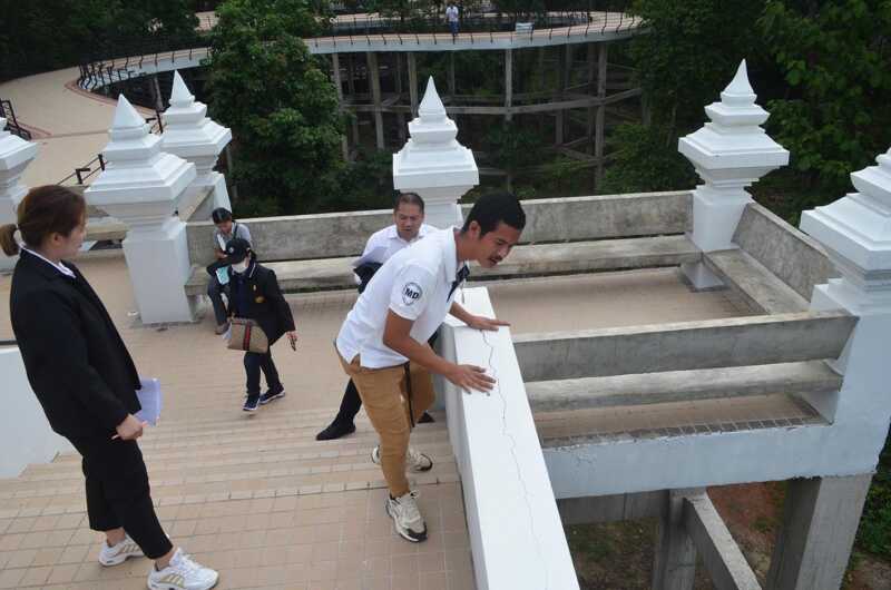 เมื่อคณะมาถึงได้เดินสำรวจบริเวณราวกันตกทางเดินไปหอระฆัง พบว่าขาโครงเหล็กราวกันตกฉีกขาดหลายจุด ทำให้ราวกันตกโยกไปมา หากมีคนไปยืนพิงอาจร่วงหล่นลงไปที่พื้นด้านล่างได้รับบาดเจ็บ ซึ่งราวกันตกแนวทางเดินถูก กธจ.พะเยา ตำหนิว่าบอบบางและไม่แข็งแรง ตลอดจนมีช่องว่างของตะแกงเหล็กด้านล่างติดกับแนวทางเดินมีช่องว่างมากเกินไปเด็กเล็กที่วิ่งไปล้มบริเวณดังอาจหลุดตกลงไปได้ ให้ทางโยธาแจ้งผู้รับเหมาแก้ไข แต่ทาง โยธาฯ จ.พะเยา อ้างว่าไม่สามารถแก้ไขแบบได้ จนมาเกิดเหตุพายุพัดราวกันตกที่ทำด้วยกระจกเทมเปอร์ หักพังเสียหายไปครึ่งหนึ่งของวงรอบ ทาง กธจ.จึงต้องแจ้งให้ทางสำนักงานโยธาฯ จ.พะเยา มาตรวจสอบแก้ไขอย่างเร่งด่วน