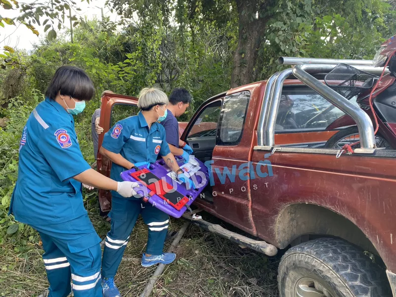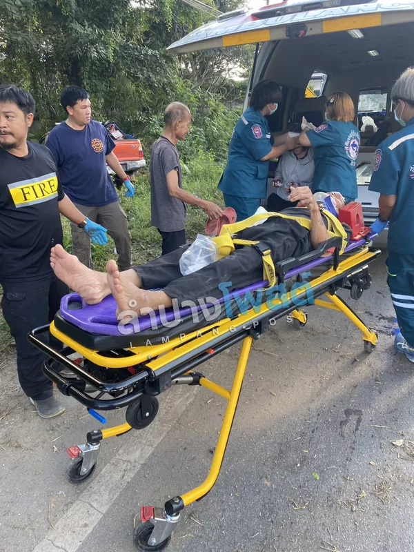 ที่เกิดเหตุเจ้าหน้าที่พบรถกระบะป้ายทะเบียนจังหวัดลำปาง ในสภาพพุ่งลงข้างทาง หน้ารถพังยับเยิน ตรวจสอบภายในรถพบผู้ได้รับบาดเจ็บหนึ่งราย เป็นเพศชาย อายุ 70 ปี อยู่ในรถกระบะ อาการสาหัสไม่รู้สึกตัว มีบาดแผลฉีกขาดบริเวณหน้าผาก อาการสาหัส ทางเจ้าหน้าที่กู้ภัยจึงทำการลำเลียงผู้ได้รับบาดเจ็บออกจากตัวรถ และประสานเจ้าหน้าที่กู้ชีพโรงพยาบาลลำปางเปลี่ยนถ่ายอย่างเร่งด่วน